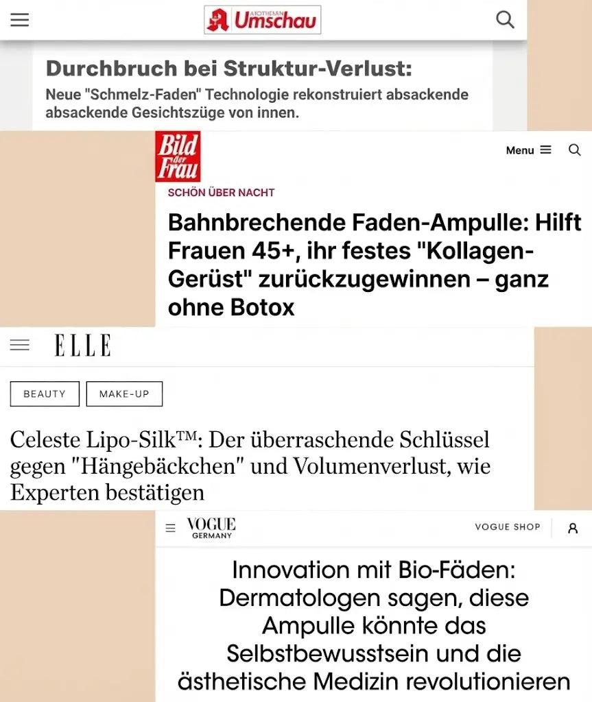 Wir präsentieren Celeste – Tiefen-Kollagen Seiden-Peptid Ampulle. Entwickelt mit der neuen Lipo-Silk™ Technologie, ermöglicht sie Ihnen eine physische Rekonstruktion Ihrer Hautstruktur – ganz ohne Nadeln oder teure Termine.